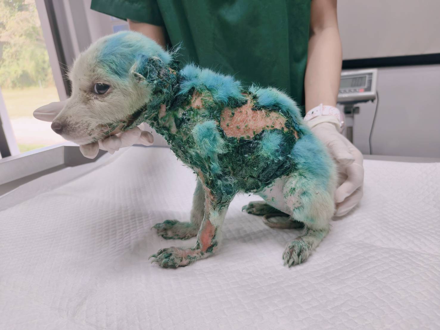 When Daisy arrived, her skin was raw, inflamed, and she was in pain. An antibiotic spray called Cyclo had been applied in an attempt to help but on a puppy’s fragile skin, it caused serious damage.